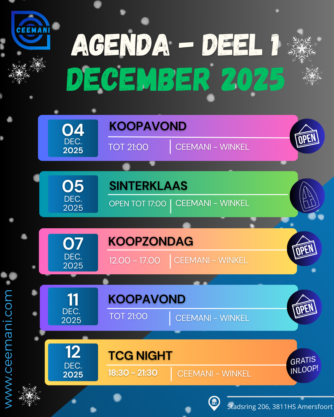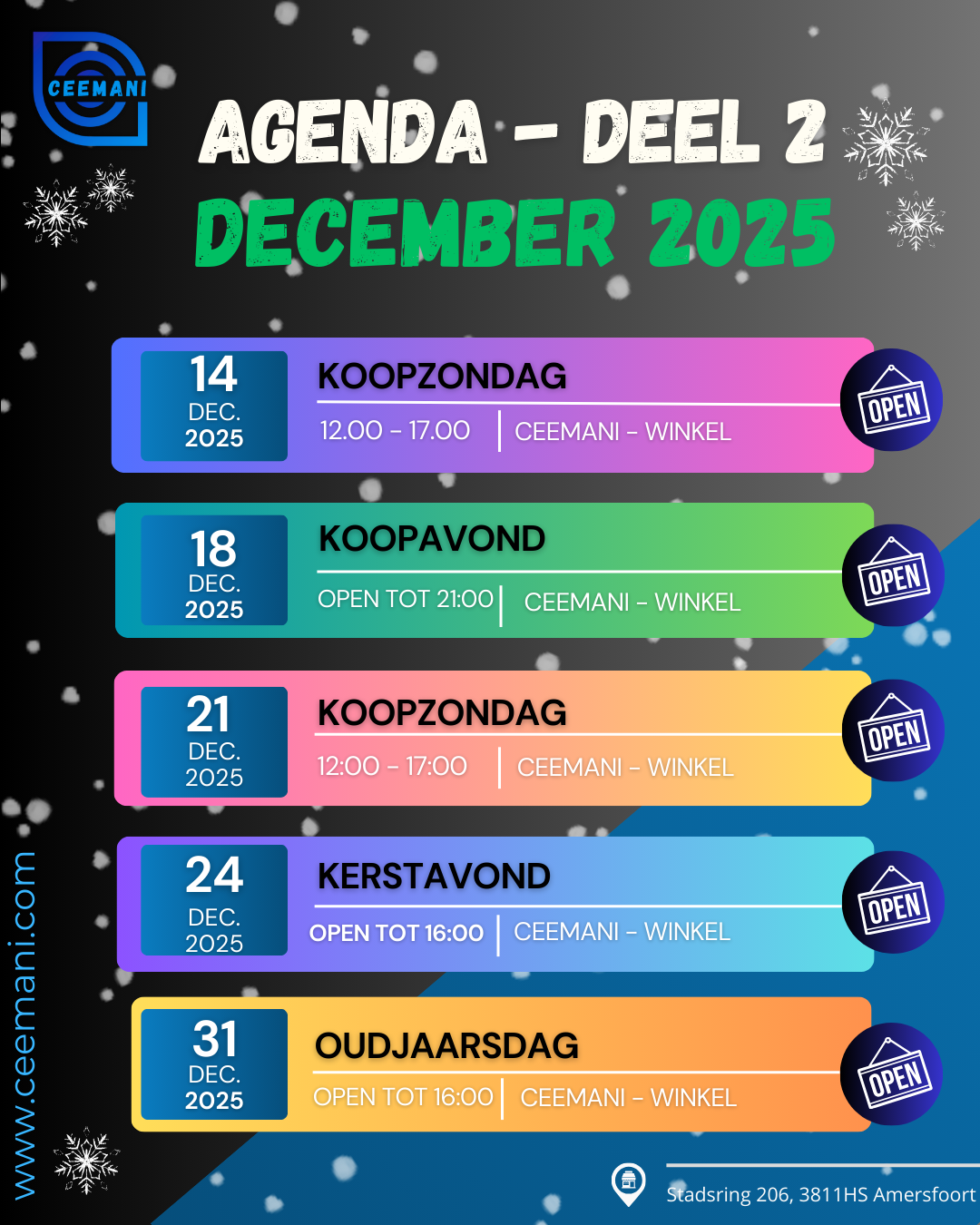De gezellige maand is aangebroken en wij hebben onze winkel weer bomvol gepland met extra openingsdagen, koopavonden. Of je nu op zoek bent naar dat laatste kerstcadeau, je collectie wilt uitbreiden of gewoon zin hebt in een gezellige Sinterklaas- of kerstvibe: je bent altijd welkom bij CEEMANI!